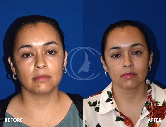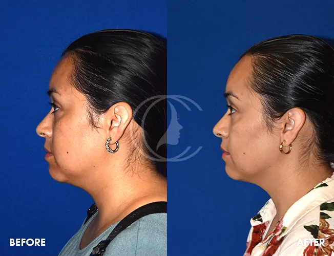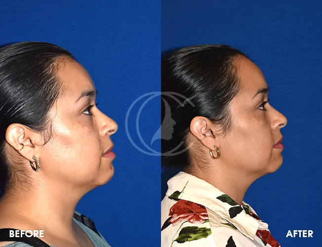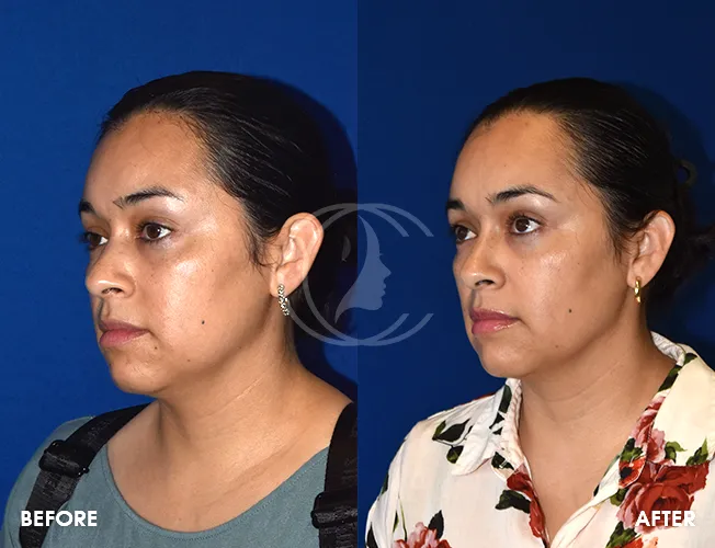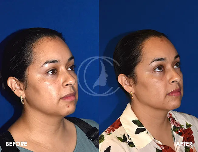 This patient wanted a more defined jawline and submental area with slimming of the lower mid-face. She is shown at 3 months after buccal fat contouring as well as chin and neck liposuction.