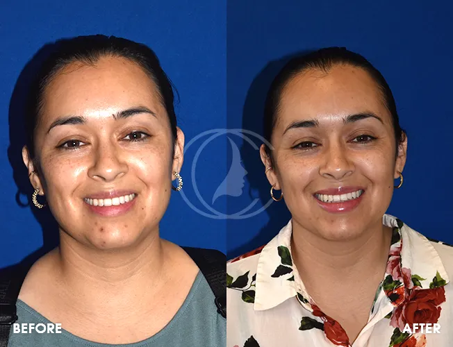 This beautiful 23 year old patient is shown after septorhinoplasty. She disliked the appearance of a dorsal hump that resulted from nasal trauma. She is now 2.5 months after her procedure with a smoother profile as well as improvement in her tip shape and position.